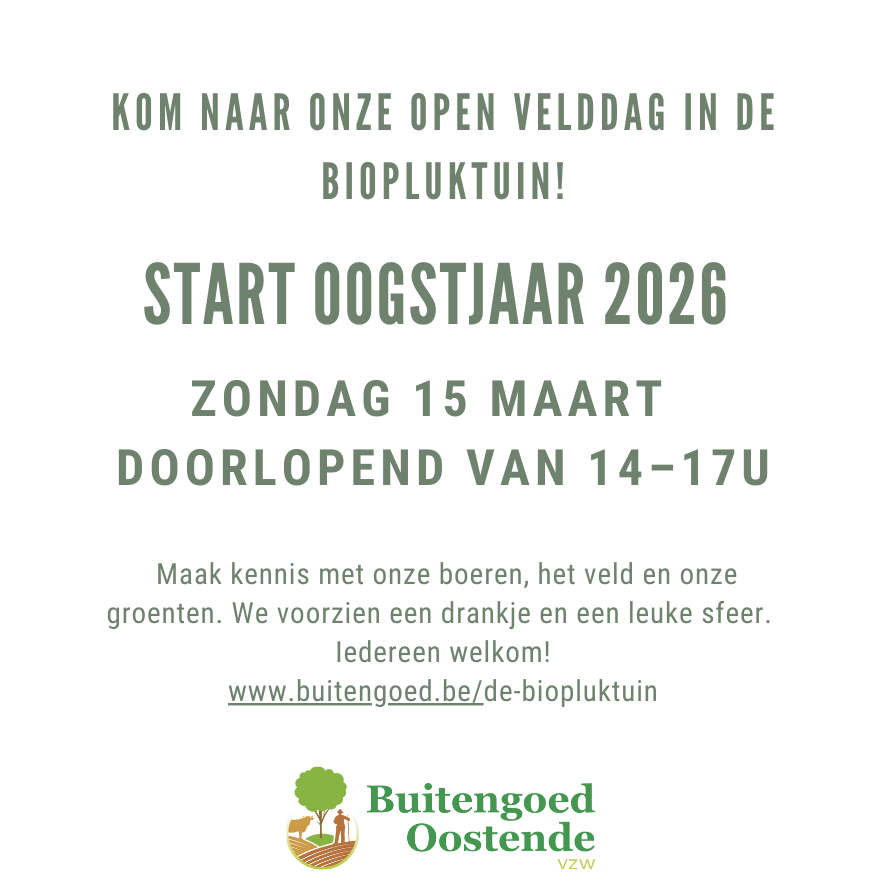 Ben je benieuwd naar hoe wij werken op de Biopluktuin? Wil je meer te weten komen over biologische landbouw of zou je graag lid willen worden van de Biopluktuin? Op zondag 15 maart openen we het veld voor iedereen tijdens onze open velddag. Tussen 14u en 17u ben je doorlopend welkom op het veld van de Biopluktuin. Maak kennis met onze boeren en vrijwilligers, ontdek hoe de Biopluktuin werkt, proef de sfeer en kom te weten hoe jij lid kan worden of kan meebouwen aan het verhaal van de Biopluktuin. Er zijn persoonlijke rondleidingen en uitleg op het veld.